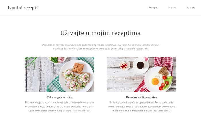 Izaberite ovaj predložak za Vaš blog posvećen putovanjima, kuhanju, modi ili zdravlju. Njegova će organizirana struktura učiniti uočljivima sve Vaše fotografije ukusnih jela i modnih dodataka. Ne zaboravite dodati i sve zanimljive podatke o sebi i svojim hobijima u kontaktnom formularu.