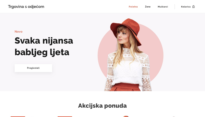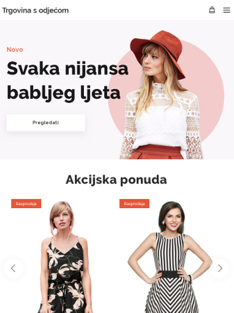 Ovaj predložak e-trgovine pomoći će Vam pri prodaji Vaše omiljene odjeće, nakita i cipela online. Organizirajte svoje proizvode u kategorije i predstavite tako kupcima nove proizvode i bestsellere. Ne zaboravite svojim proizvodima pridružiti i lijepe fotografije proizvoda, te na kraju dodati svoj kontakt s Uvjetima i odredbama o kupovini.